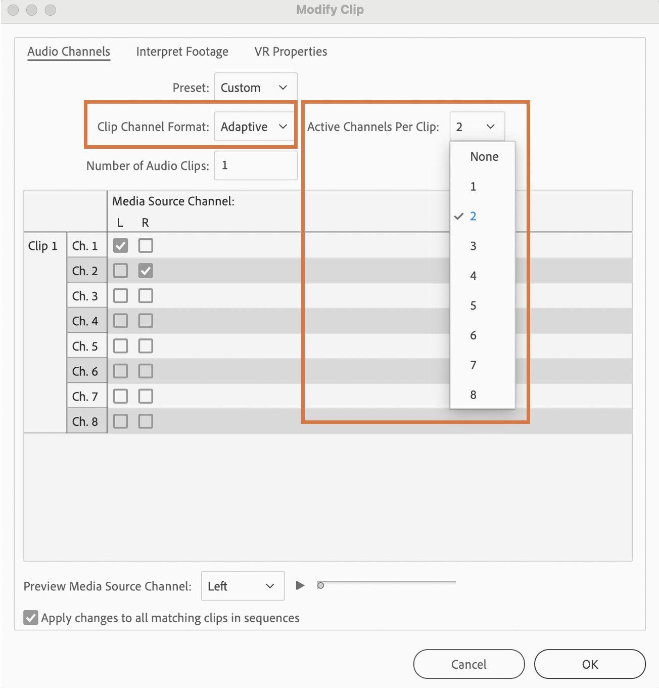 Use the dropdowns to add, remove, or change Active Channels Per Clip, up to a maximum of 8 channels.