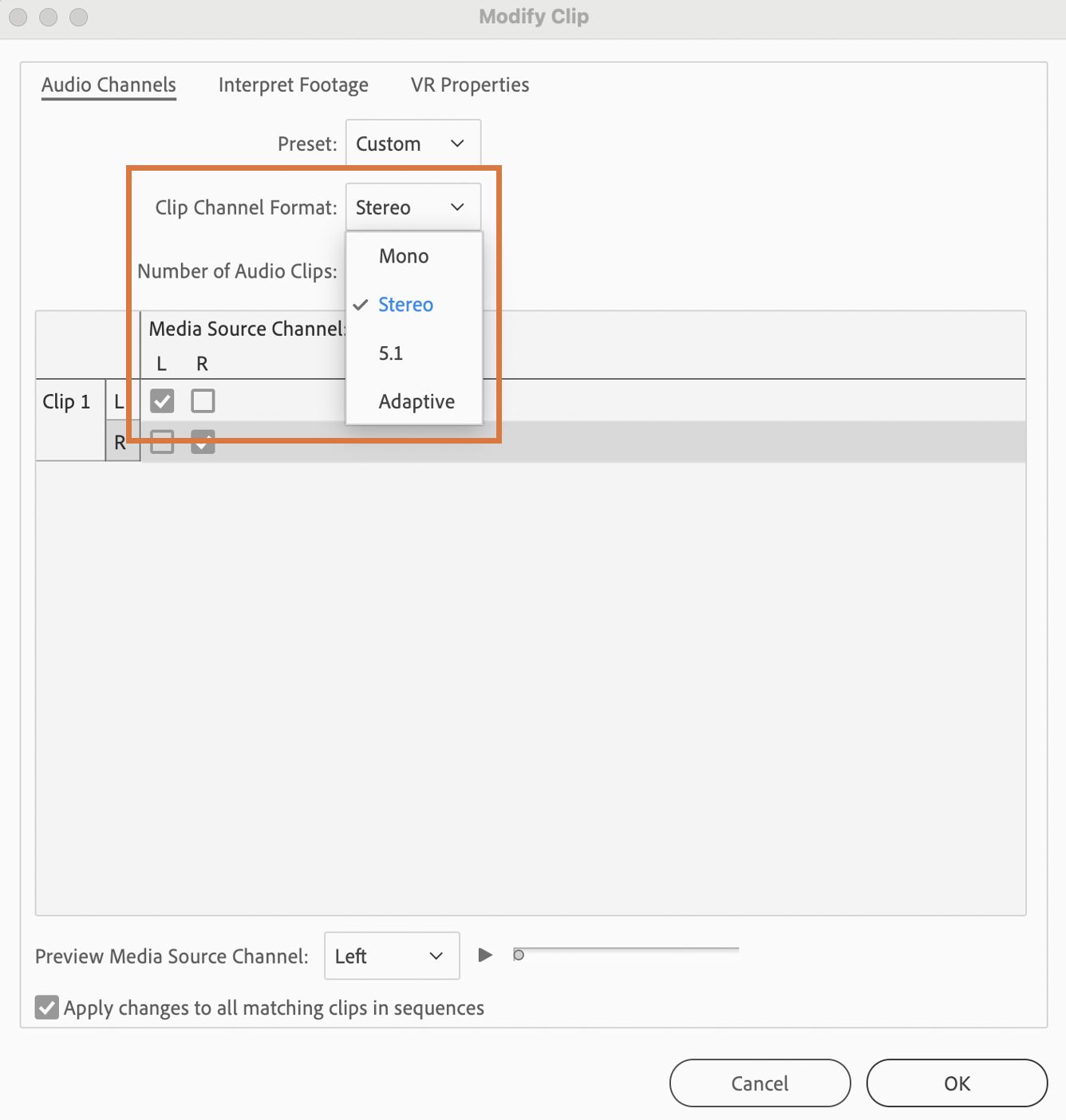 - Or, from the Clip Channel Format dropdown, select Adaptive while leaving the preset as Custom if you want to enter custom settings.