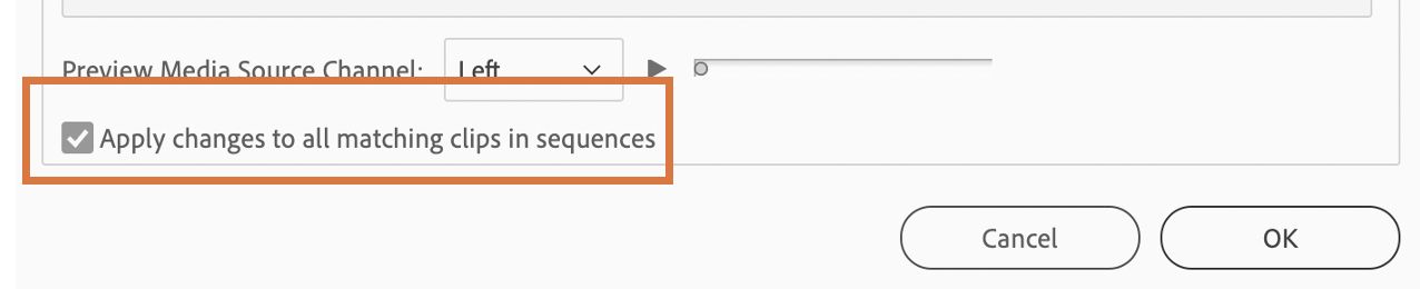 By default, Apply changes to all matching clips in sequences is selected. Uncheck this option if you want to apply the changes to just the selected clip.