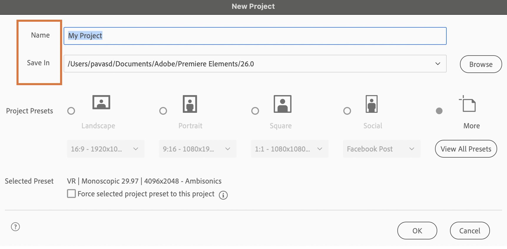 - Then, click OK in the New Project dialog to create your VR project sequence.