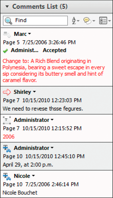 L’état de la révision apparaît sous le commentaire, avec le nom de la personne qui a défini cet état. Si un autre réviseur définit l’état de révision du même commentaire, les deux états ainsi que le nom des deux réviseurs s’affichent dans la liste.