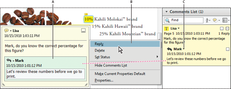 La fonction de réponse aux commentaires est particulièrement utile dans les révisions partagées, lorsque les participants peuvent lire les commentaires des uns et des autres. L’initiateur de la révision peut aussi s’en servir pour tenir les réviseurs informés du traitement de leurs suggestions. Si un ou plusieurs réviseurs répondent à un message, le lot de réponses est appelé série. Les deux premières réponses d’une série apparaissent dans la fenêtre contextuelle de la note. Dans la liste des commentaires, toutes les réponses sont affichées. Les réponses sont décalées sous le commentaire d’origine. Le nombre de réponses reçues pour un commentaire s’affiche dans un cadre lorsque vous pointez sur le commentaire.