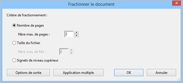 Il est possible de fractionner un ou plusieurs documents en un jeu de fichiers plus petits. Vous pouvez définir le fractionnement d’un document selon le maximum de nombre de pages ou de taille de fichier, ou en fonction des signets de premier niveau.