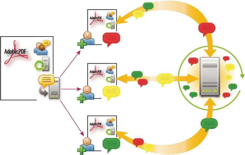 Les révisions partagées constituent la meilleure forme de collaboration puisque les participants peuvent lire les commentaires des autres et y répondre. Les commentaires des participants sont stockés dans un référentiel sur un serveur interne. Acrobat synchronise les commentaires à intervalles réguliers afin de télécharger les toutes dernières modifications. Les réviseurs sont avisés des nouveaux commentaires dès leur ajout, et peuvent consulter les commentaires des autres réviseurs et y répondre.