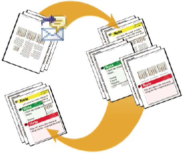 Lors d’une révision par messagerie électronique, l’initiateur envoie un fichier PDF aux réviseurs sous la forme d’une pièce jointe. Les réviseurs ajoutent leurs commentaires et renvoient le document en cliquant sur le bouton Envoyer les commentaires de la barre de message du document. Une fois qu’il a reçu ces commentaires, l’initiateur peut les fusionner dans sa propre version du fichier PDF.