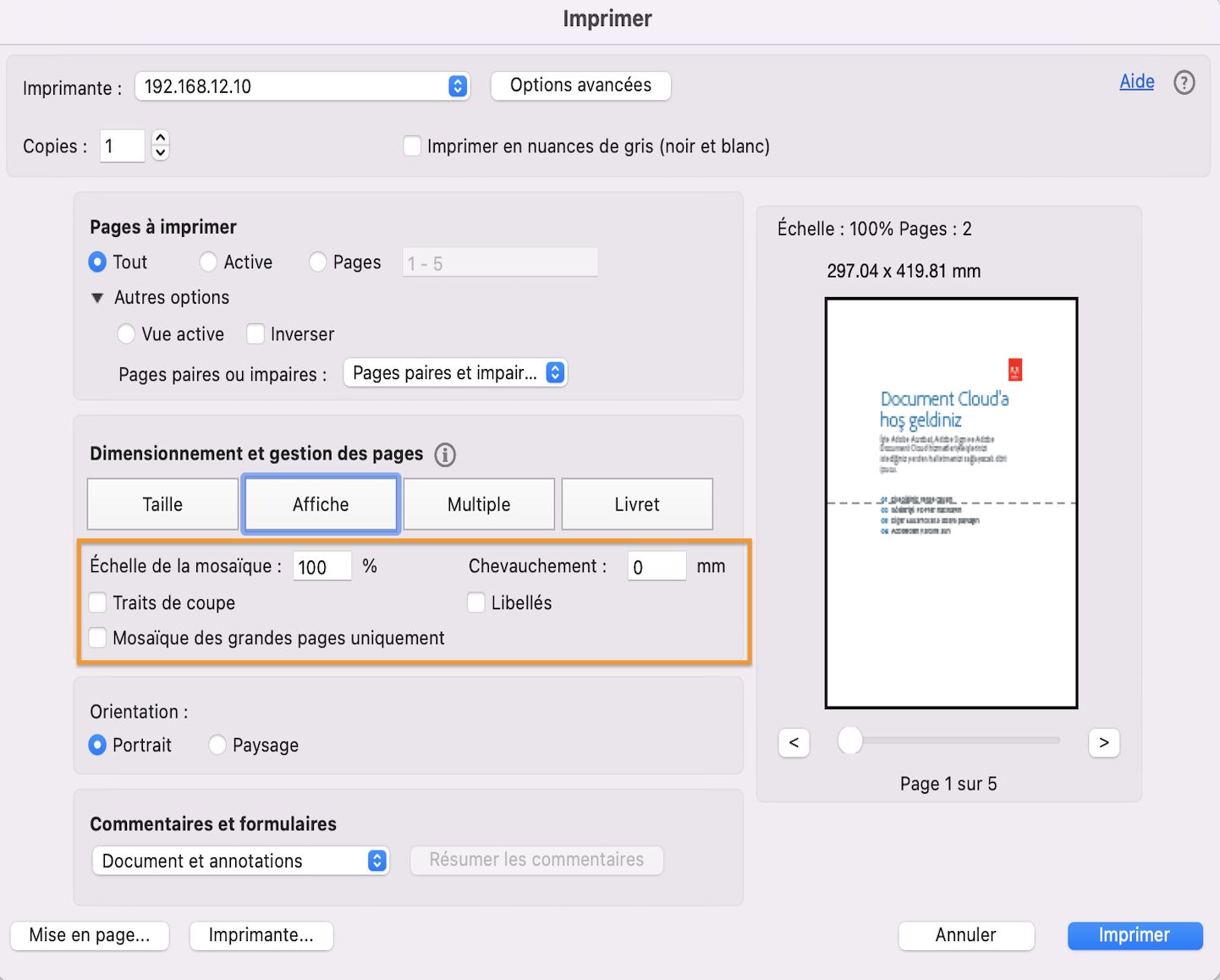 Sélectionnez Affiche dans la section Dimensionnement et gestion des pages de la boîte de dialogue Imprimer.