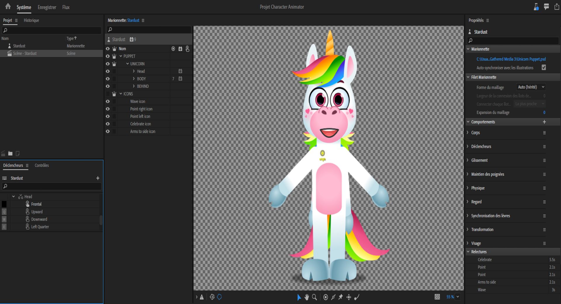 L’espace de travail Système vous permet de modifier la structure d’une marionnette. Vous pouvez ajouter ou modifier des comportements, réorganiser les calques de marionnette, ajouter des poignées à une    marionnette   ou encore modifier des déclencheurs de clavier. Pour accéder à l’espace de travail, effectuez l’une des opérations suivantes :