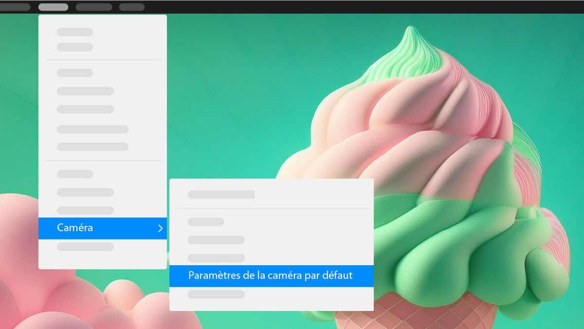 Utilisez le menu Vue pour ajuster la vue personnalisée et les paramètres de caméra par défaut, que vous visualisiez à travers un calque de caméra, la caméra active par défaut ou une vue personnalisée.
