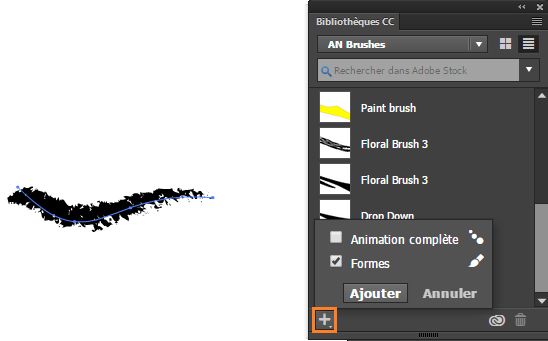 Dans le panneau Bibliothèques CC, cliquez sur le bouton + en bas du panneau, puis sélectionnez Pinceaux > Ajouter.  L’option de transfert de pinceaux est activée seulement si la forme sélectionnée sur la scène a recours aux pinceaux artistiques. Il n’est pas possible d’enregistrer les pinceaux Motif dans la bibliothèque CC. L’option de transfert de pinceaux est activée seulement si la forme sélectionnée sur la scène a recours aux pinceaux artistiques. Il n’est pas possible d’enregistrer les pinceaux Motif dans la bibliothèque CC.
