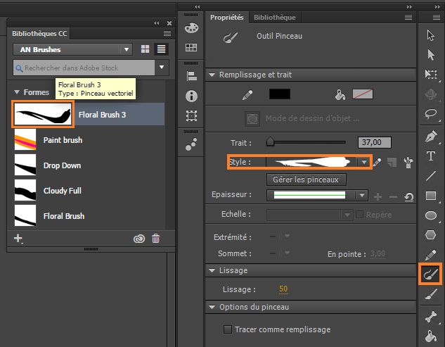 Cliquez sur Ajouter pour ajouter le pinceau au document. Le nouveau pinceau est visible dans la liste déroulante Trait du panneau Propriétés. Utilisation des pinceaux de la bibliothèque CC Utilisation des pinceaux de la bibliothèque CC