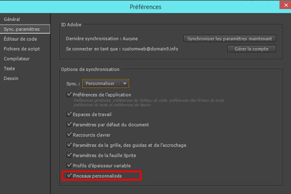 Les pinceaux personnalisés que vous créez peuvent être synchronisés avec le cloud par le biais des préférences d’Animate. Pour ce faire, sélectionnez Modifier > Préférences sous Windows ou Animate > Préférences sous Mac. L’option permettant de synchroniser des pinceaux personnalisés dans la section Synchroniser les paramètres est illustrée ci-dessous :