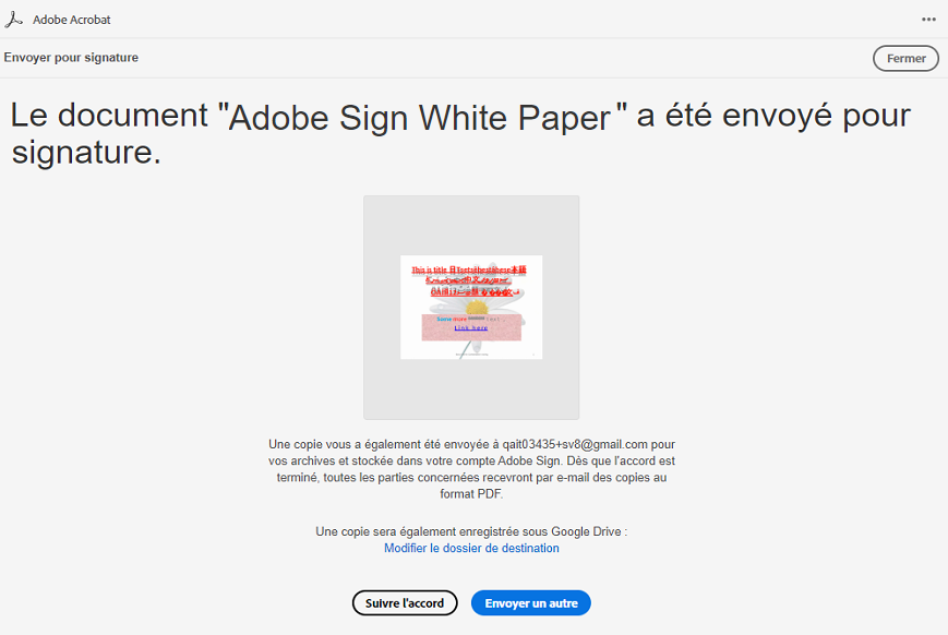 Lorsque vous envoyez un accord pour signature, une copie du contrat est stockée dans votre bibliothèque de documents Google Drive. Selon le statut de l’accord, un suffixe (in-progress-Acrobat Sign), (completed-Acrobat Sign), (failed-Acrobat Sign) ou (expired-Acrobat Sign) est ajouté au nom de l’accord.