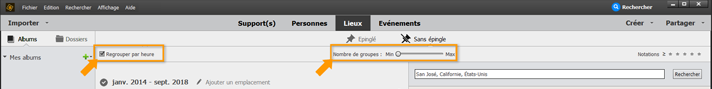 L’option Regrouper par heure est sélectionnée par défaut. Cette option organise vos photos selon la date/l’heure, et vous permet d’ajouter plus facilement des informations de localisation aux fichiers multimédias créés dans un intervalle de temps donné. Vous pouvez, par exemple, organiser plus facilement les photos qui ont été prises lors de votre anniversaire à Hawaï, car vous pouvez étiqueter toutes les photos prises à ce moment-là avec l’emplacement Hawaï.