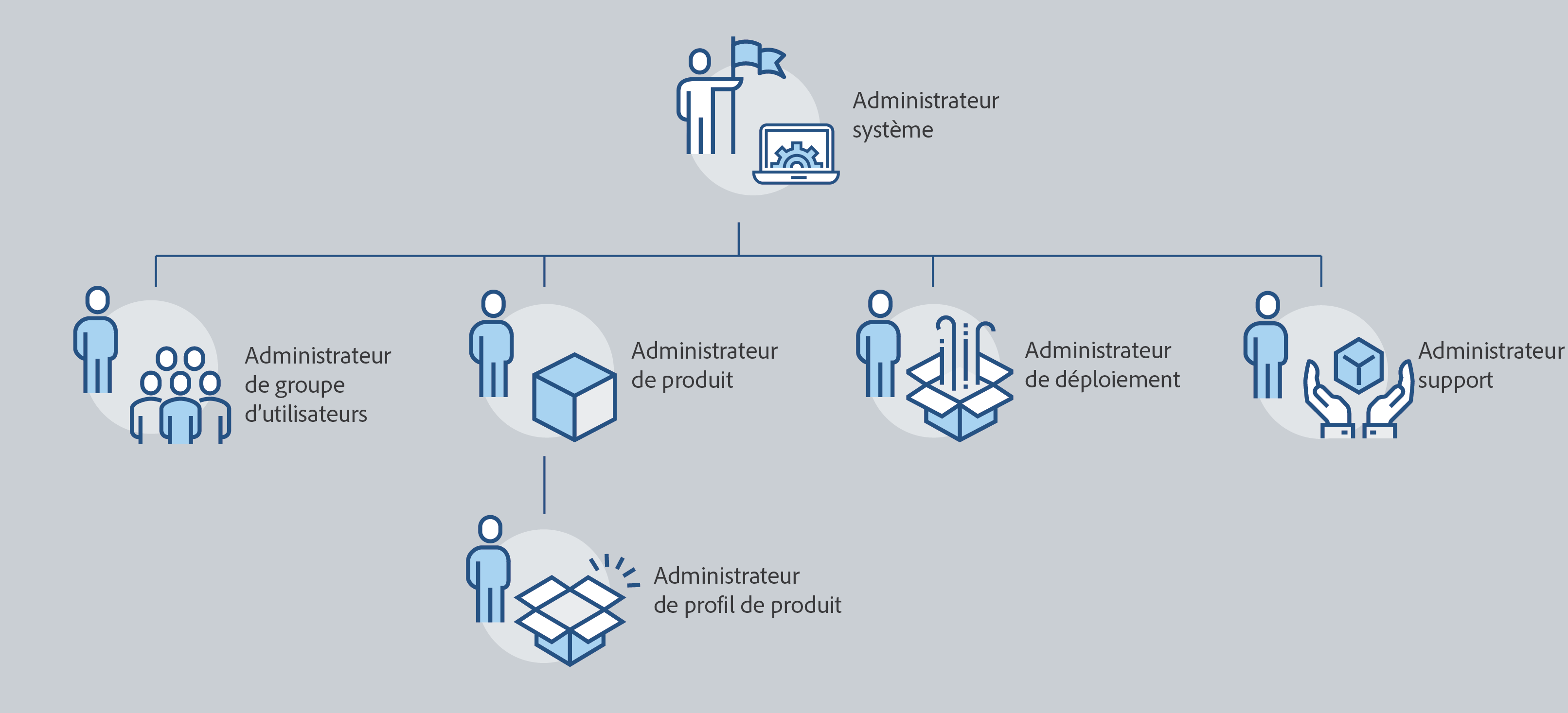 Utilisez le portail Adobe Admin Console pour configurer une structure administrative flexible afin de gérer les utilisateurs et utilisatrices et les licences. Les administrateurs et administratrices système ont le niveau d’accès le plus élevé et peuvent attribuer d’autres rôles d’administration.
