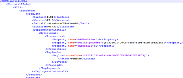 Le fichier AdobeCCUninstallerConfig.xml définit les nœuds dans le nœud UninstalInfo : RIBS et HD.