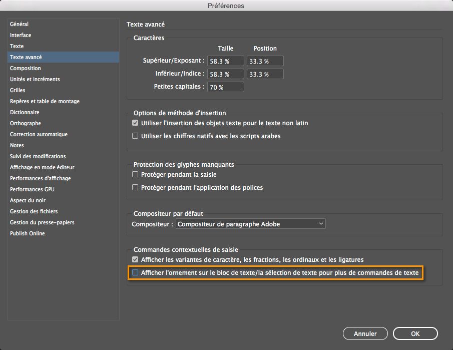 Dans InDesign, accédez à Édition > Préférences > Texte avancé.