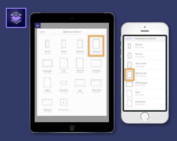 Ouvrez Comp CC, appuyez sur le signe + pour créer un projet, puis sélectionnez le format le mieux adapté à votre projet web, mobile ou pour l'impression. Pour ce tutoriel, choisissez iPad (portrait).