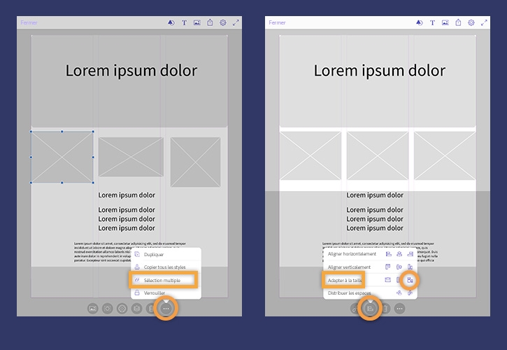 Appuyez sur un espace réservé à une image, puis sur l'icône Plus au bas de l'écran, et choisissez Sélection multiple. Appuyez sur les deux autres espaces réservés à des images dans votre mise en page pour les ajouter à la sélection, puis appuyez sur Terminé.