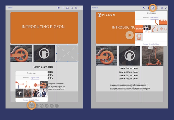 Pour choisir une image de résolution maximale à partir des Bibliothèques Creative Cloud, appuyez sur Mes bibliothèques, puis sélectionnez la bibliothèque Pigeon Assets. Appuyez sur l'image de l'homme à trottinette pour remplir le cadre de l'espace réservé. Répétez l'opération pour ajouter d'autres images.