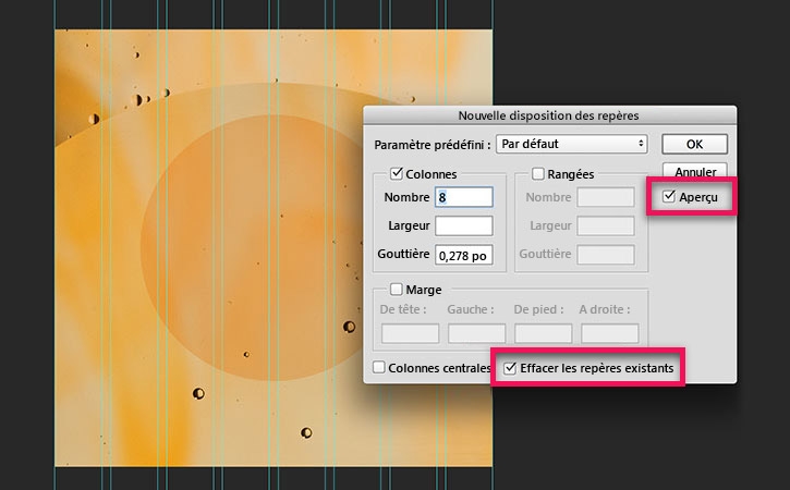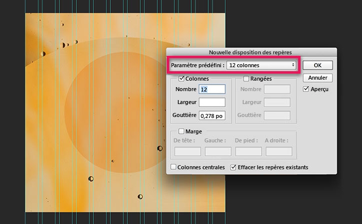 Dans la boîte de dialogue Nouvelle disposition des repères, passez du paramètre prédéfini « Par défaut » à « 12 colonnes ». À noter que Photoshop crée automatiquement des gouttières (ou espacement) entre les colonnes en fonction du nombre de colonnes spécifié.