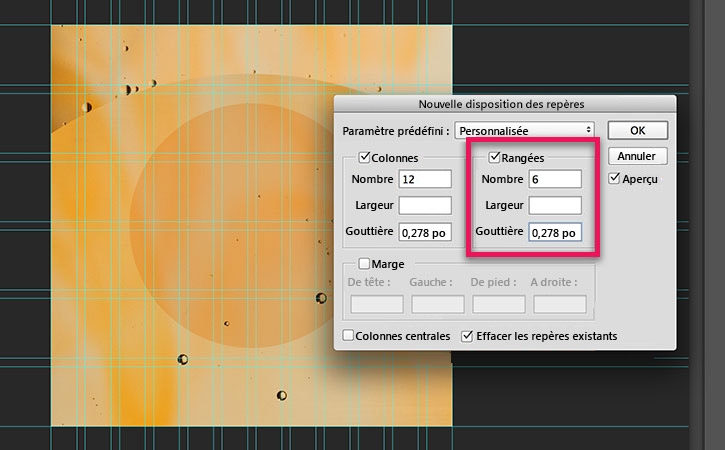 Dans la boîte de dialogue Nouvelle disposition des repères, sélectionnez l’option Rangées et spécifiez « 6 » dans le champ Nombre. Pour les gouttières, indiquez la même valeur que celle appliquée aux colonnes, à savoir « 0,278 po » (ou 20 px). Les changements sont automatiquement répercutés dans le document.