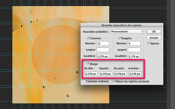 Dans la boîte de dialogue Nouvelle disposition des repères, sélectionnez l'option Marge. Saisissez la valeur « 0,278 po » (ou 20 px) dans les champs De tête, Gauche, De pied et À droite (soit la même valeur que pour les gouttières de colonne et de rangée). Les colonnes et les rangées font alors l'objet d'un rétrécissement pour s’adapter aux marges.
