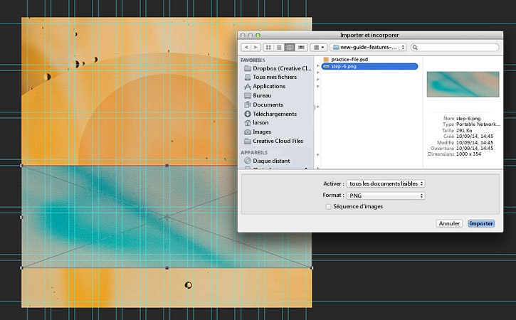 Pour ajouter une image dans votre document, choisissez Fichier > Importer et incorporer, puis sélectionnez le composant « step-6.jpg » dans les fichiers d’exemple que vous avez téléchargés. Cliquez sur Importer.
