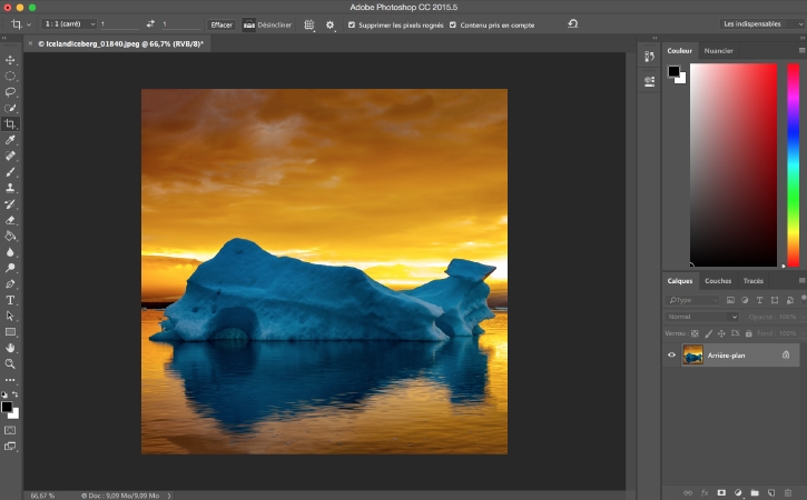 Vérifiez que l’outil Recadrage est toujours sélectionné, puis cliquez sur le menu Rapport L/H dans la barre d’options, et sélectionnez 1 : 1 (carré). Une zone de recadrage carrée apparaît alors sur la photo. Cliquez dessus, puis déplacez-la pour repositionner l’iceberg à l’intérieur.