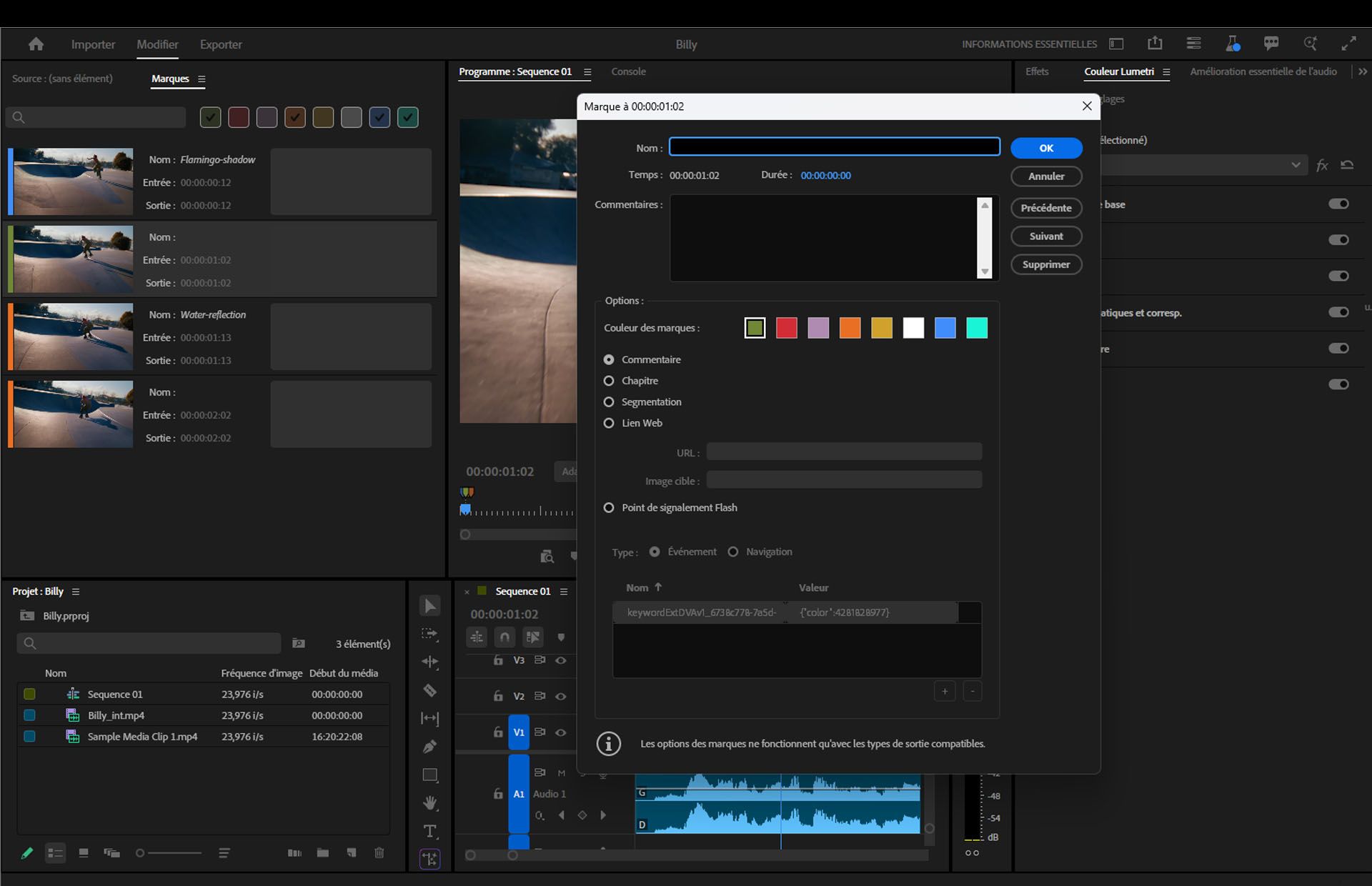 Le panneau Marques (Fenêtre > Marques) vous permet de voir toutes les marques dans un clip ouvert ou une séquence ouverte.Double-cliquez sur un marqueur pour afficher ses propriétés en détail.
