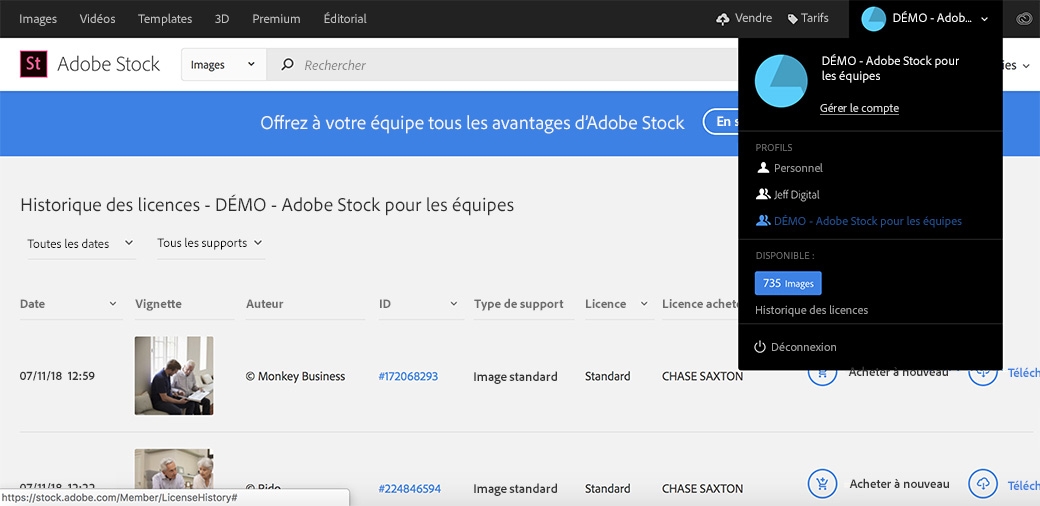 Ouvrez la page Adobe Stock et vérifiez que votre profil correspond au compte de votre équipe. Le nombre de licences disponibles pour votre équipe apparaît en bleu. Ce compteur est mis à jour dès que des membres de votre équipe acquièrent la licence d'une image.