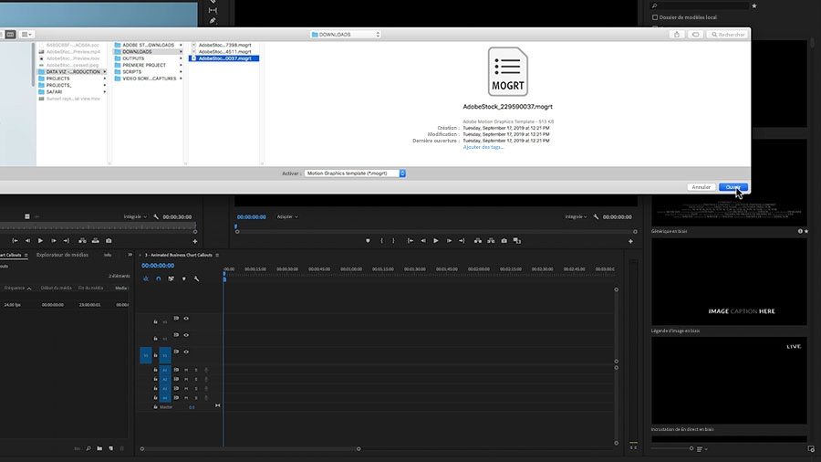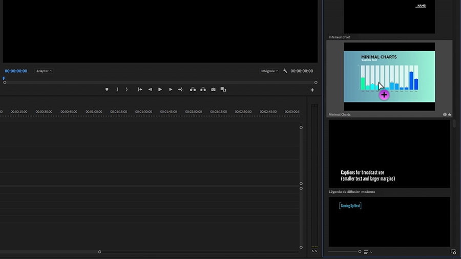 Dans le panneau Objets graphiques essentiels, cliquez sur l'onglet Parcourir. Dans le coin inférieur droit du panneau, cliquez sur le bouton « + » pour importer le modèle d'animation graphique que vous avez téléchargé.