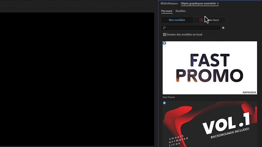Remarque : vous pouvez rechercher les mêmes modèles en ligne et en acheter la licence sur www.stock.adobe.com ou dans le panneau Objets graphiques essentiels de Premiere Pro.