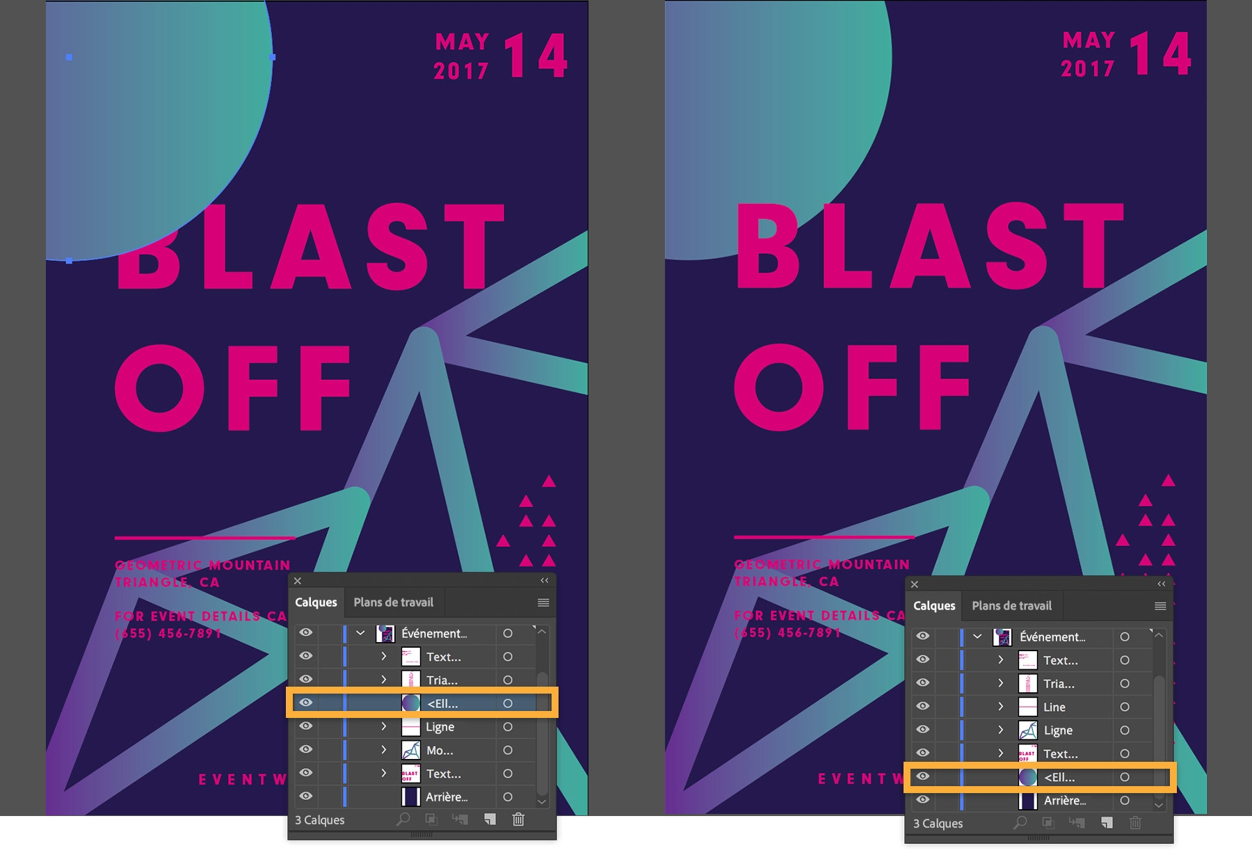 Dans le panneau Calques, recherchez le groupe de calques Événement sportif bleu. Cliquez sur l'œil en regard des calques de ce groupe pour les masquer ou les afficher et voir leur agencement. Pour que le cercle apparaisse derrière le titre, placez le calque correspondant sous le calque Texte du haut.