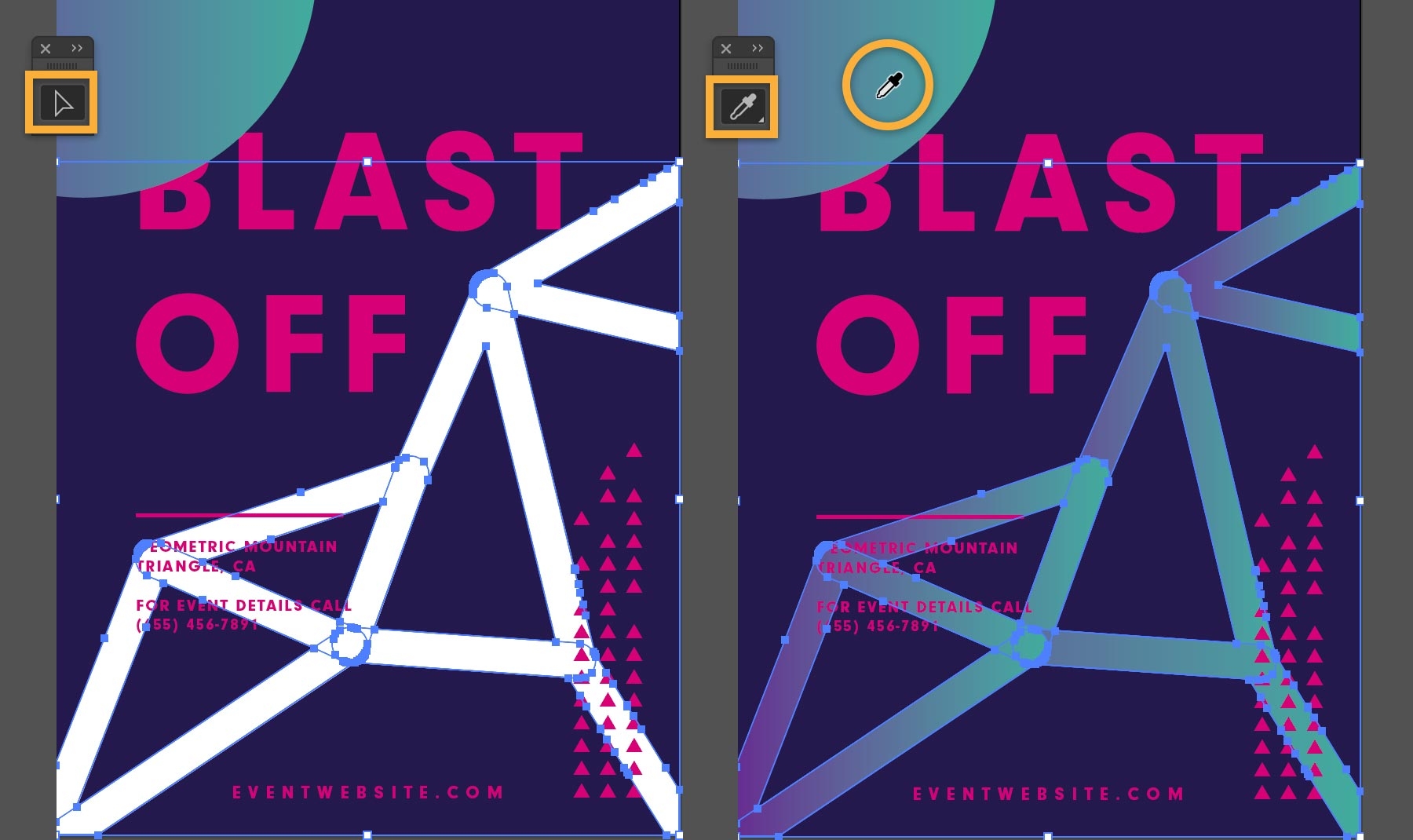 Vous pouvez appliquer le dégradé à une autre partie de l'affiche pour créer des rappels visuels. À l'aide de l'outil Sélection, cliquez sur les bandes blanches pour les sélectionner. Activez ensuite l'outil Pipette et cliquez à l'intérieur du cercle pour appliquer instantanément le même dégradé.
