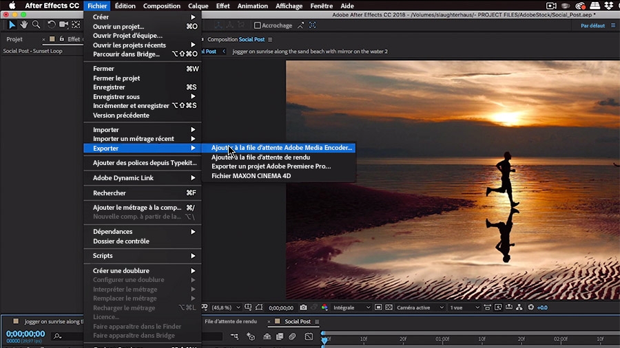 Sélectionnez Fichier > Exporter > Ajouter à la file d'attente Adobe Media Encoder pour exporter votre composition vers Encoder.