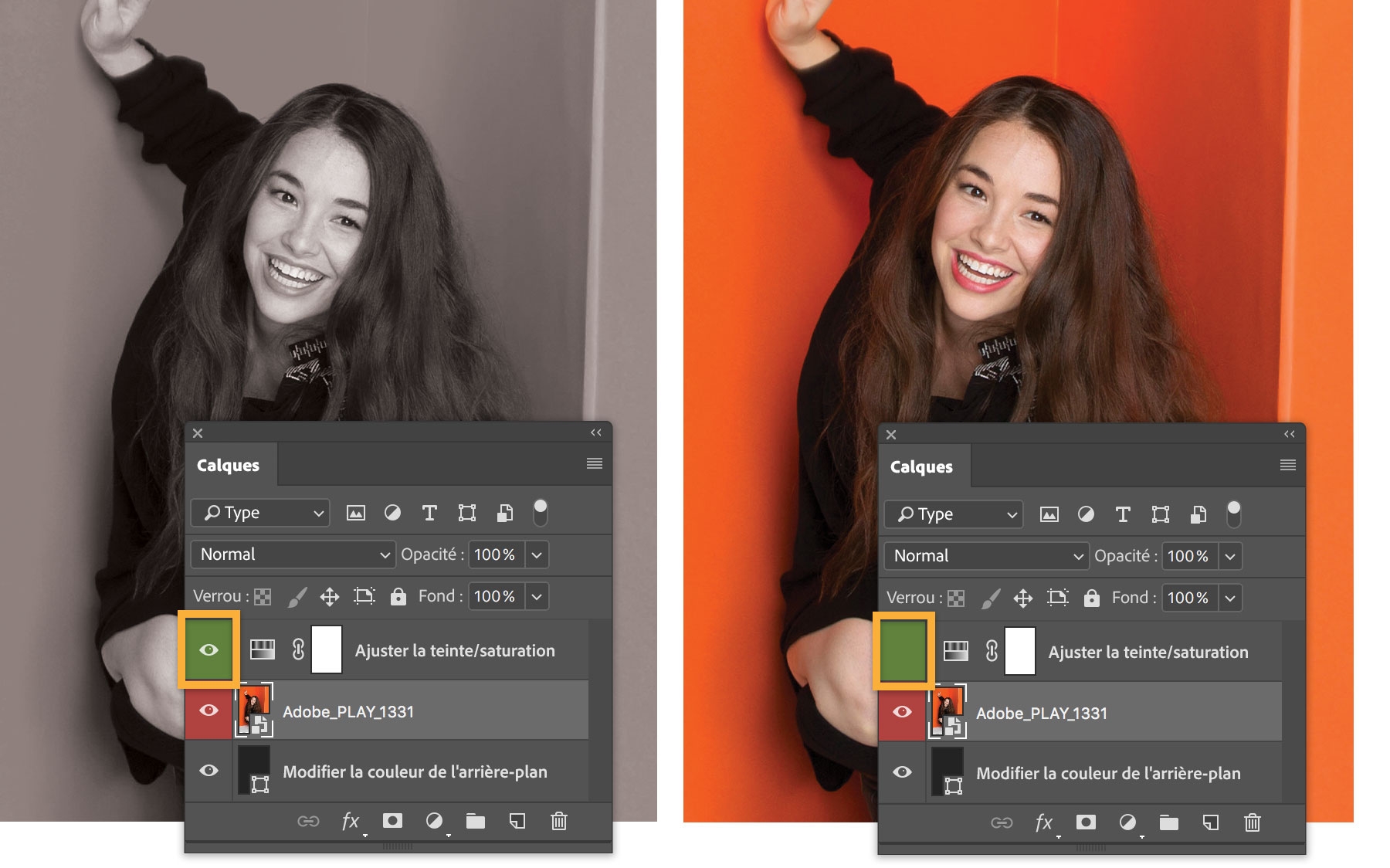 Si vous avez utilisé une photo couleur, vous constaterez qu'elle a été automatiquement convertie en noir et blanc, en raison du calque de réglage Teinte/Saturation placé directement au-dessus du calque de votre photo dans le groupe. Cliquez plusieurs fois sur l'icône d'œil pour afficher et masquer l'effet appliqué à la photo.