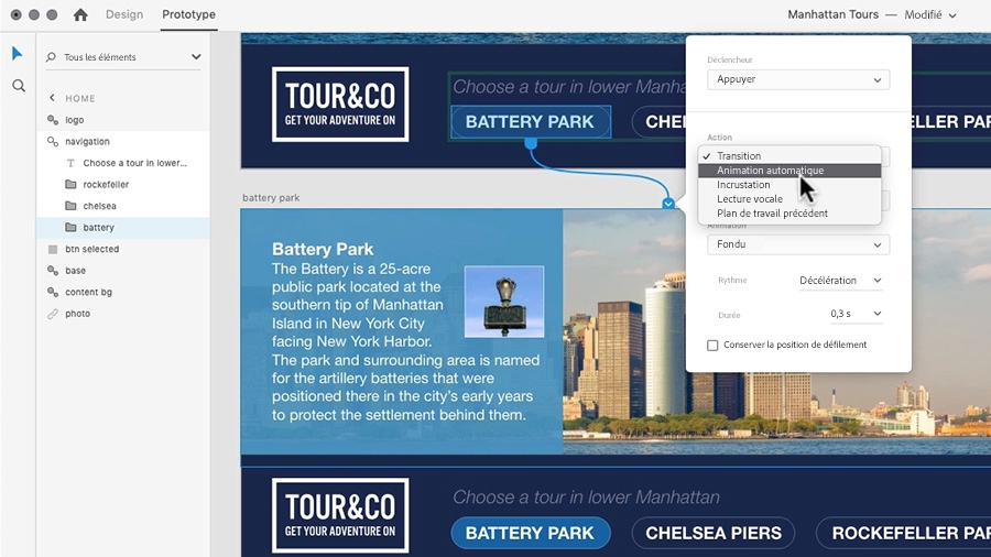 Basculez vers l'espace de travail Prototype de XD et sélectionnez le bouton Battery Park sur le plan de travail d'accueil. Créez un lien entre le bouton sélectionné et le second plan de travail et choisissez l'action de transition Animation automatique. Définissez une durée de 2,5 secondes dans le panneau des propriétés du lien, puis cliquez en dehors du panneau pour appliquer les modifications.