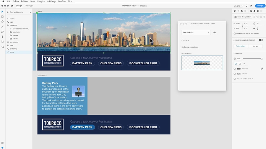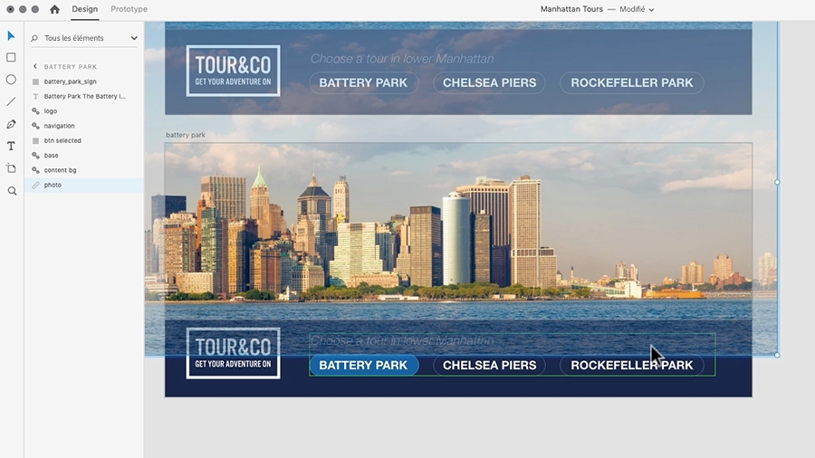 Dupliquez le plan de travail dans XD et affichez les autres calques, notamment le texte, les libellés et les modifications des boutons de navigation. Redimensionnez et repositionnez ensuite la photo de ville de façon à montrer un plan agrandi associé à la zone d’intérêt.