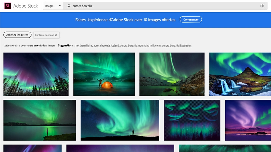 Recherchez une image correspondant à l'offre de votre entreprise. Dans cet exemple, nous avons saisi « Aurora Borealis, northern » dans le champ de recherche pour trouver une image adaptée au séjour dans le Grand Nord proposé par notre entreprise.
