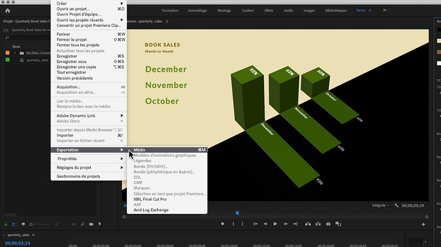 Dès que vous jugez l'aspect de votre diagramme animé satisfaisant, effectuez le rendu du diagramme sous forme de fichier vidéo. Choisissez Fichier > Exportation > Média dans Premiere Pro pour démarrer le processus. Choisissez le format H.264 (MP4) et cliquez sur File d'attente pour lancer Adobe Media Encoder.
