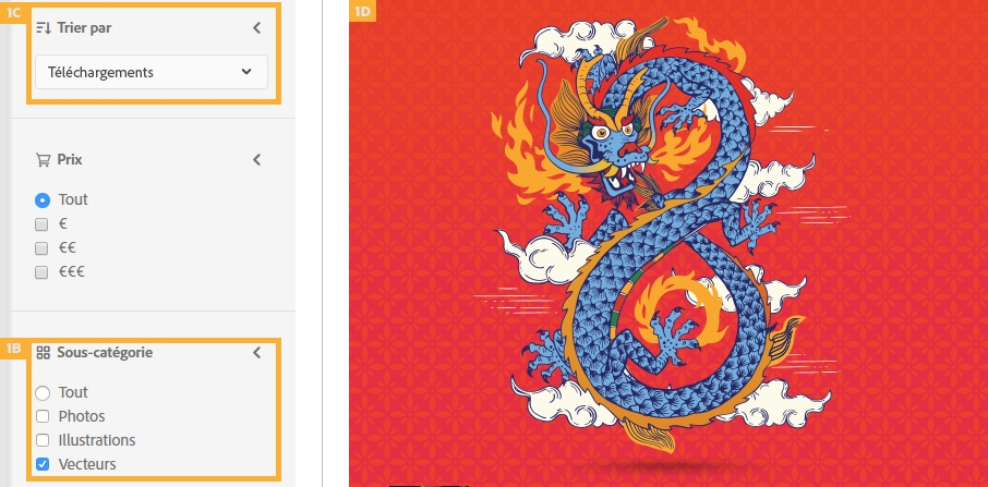 - Pour découvrir les images qui se vendent le mieux : rendez-vous sur Stock.Adobe.com et lancez une recherche. Filtrez les résultats sur les images vectorielles (1B) et triez-les par téléchargement (1C).