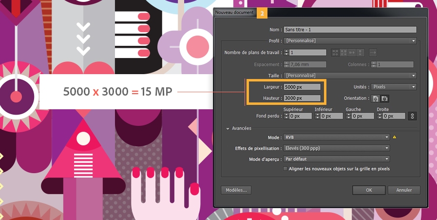 Pour soumettre une image sur Adobe Stock, votre plan de travail (2) doit être configuré au minimum sur 15 mégapixels (MP). Vous vous demandez peut-être combien de mégapixels compte votre plan de travail ?