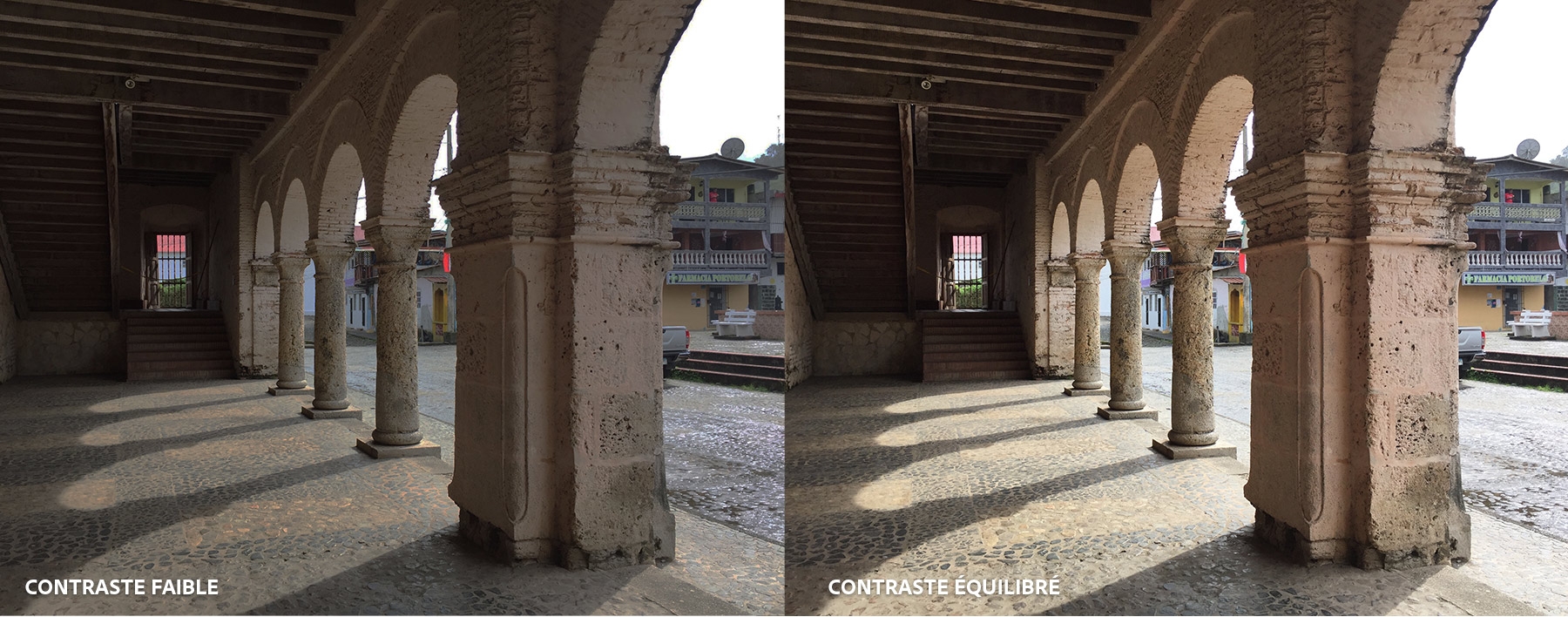 Optez pour un niveau de contraste raisonnable ; une image fortement contrastée présente des tons clairs et foncés extrêmes, tandis qu'une image faiblement contrastée peut paraître terne.