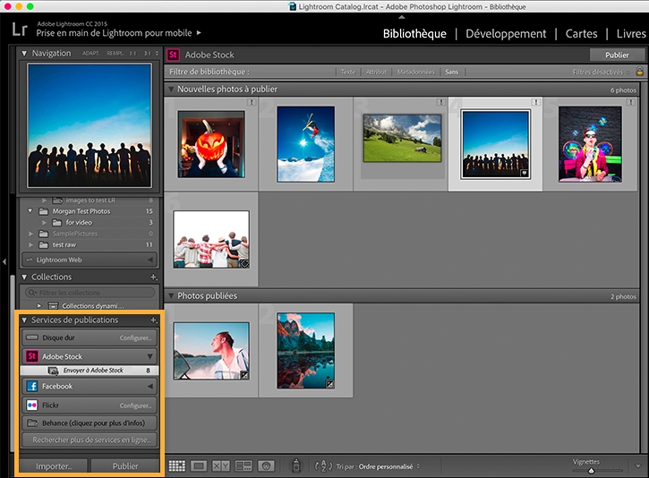 Dans le mode Bibliothèque de Lightroom Classic CC, sélectionnez les photos à transférer sur Adobe Stock, puis faites-les glisser vers Adobe Stock sous Services de publications. Finalisez votre soumission sur le portail Contributeur.