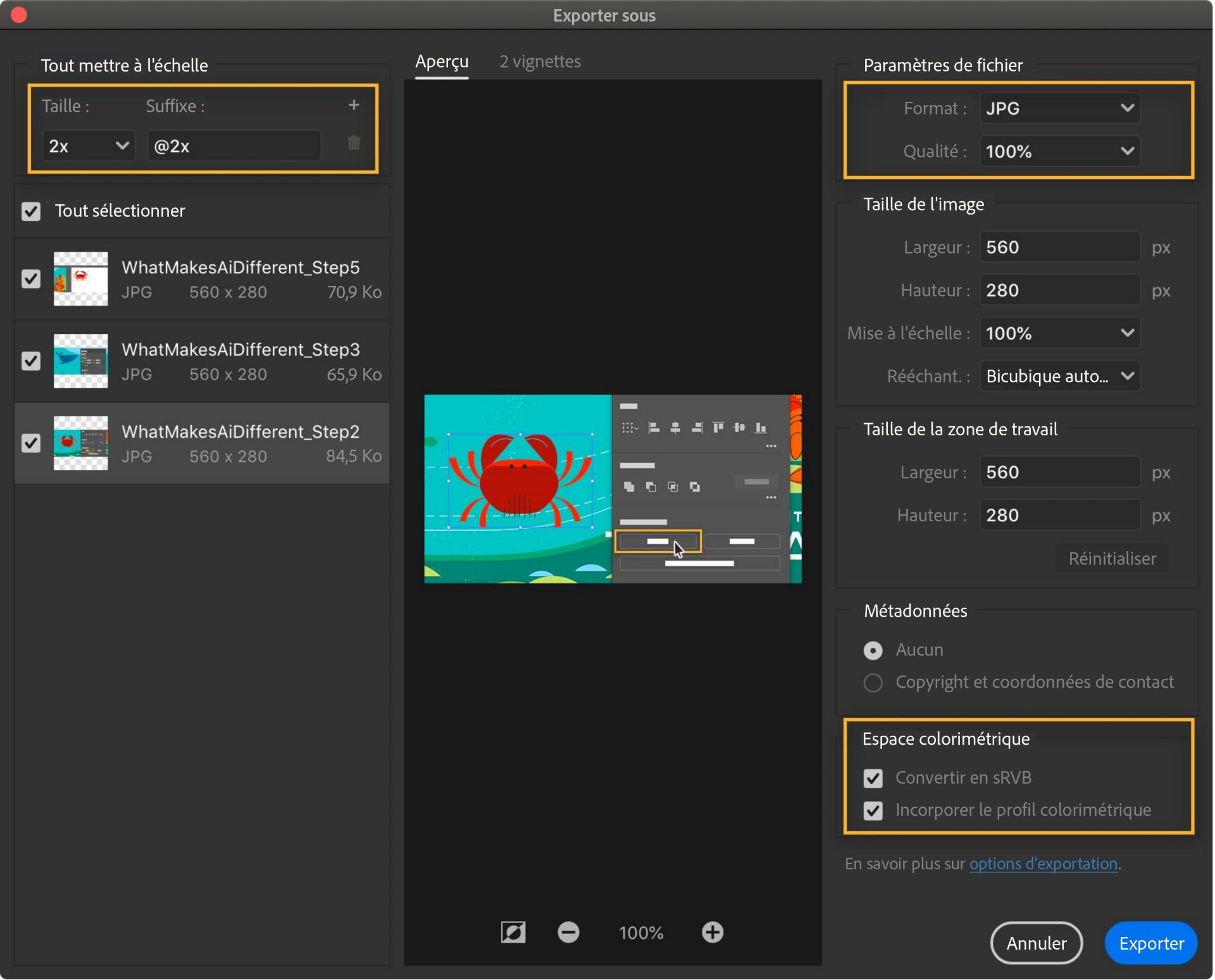 - PS : Choisissez Fichier > Exportation > Exporter sous, puis appliquez les paramètres ci-dessous.