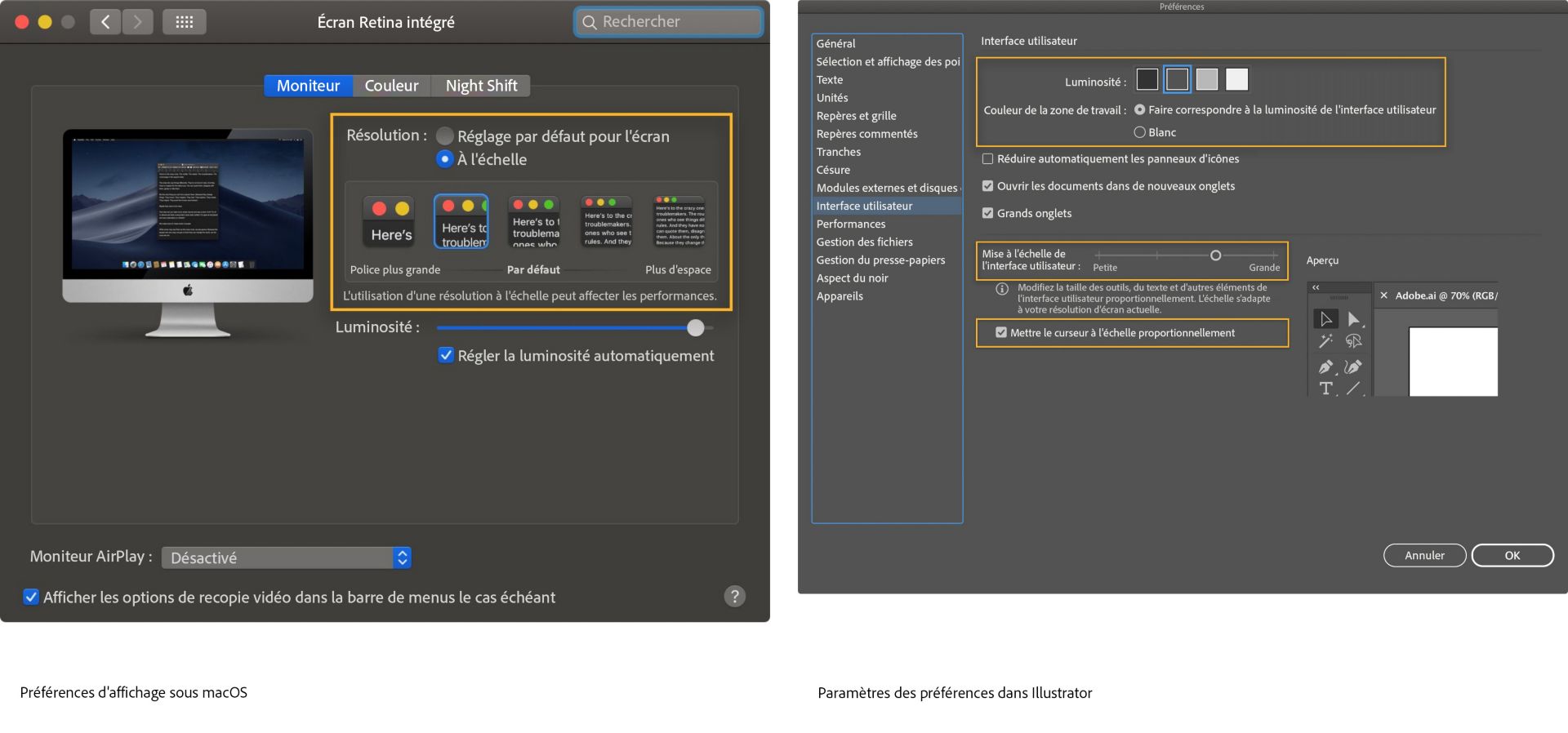 - Sous macOS, accédez à Préférences système > Moniteurs, puis appliquez les réglages indiqués ci-dessous :