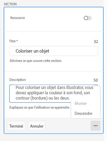 - Sections : les tutoriels sont composés de sections. Il s’agit d’outils organisationnels utilisés pour regrouper des étapes.