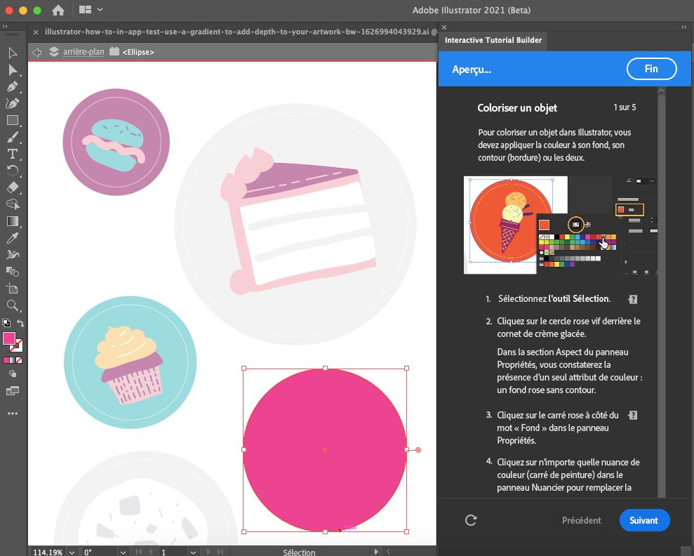 Les tutoriels guidés sont des tutoriels pratiques, accessibles aux utilisateurs dans Illustrator sur leur ordinateur. Les tutoriels se composent d’infobulles et d’un panneau Découvrir.