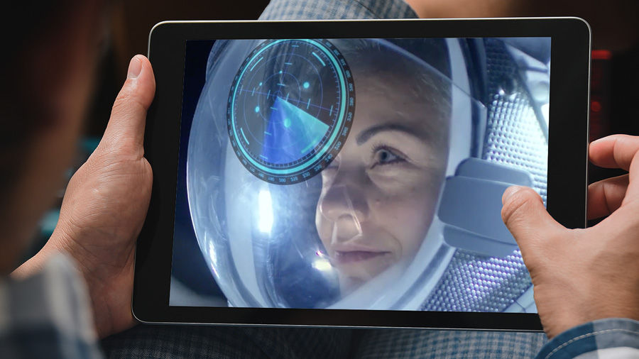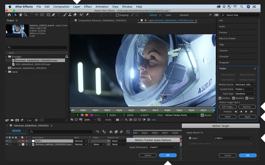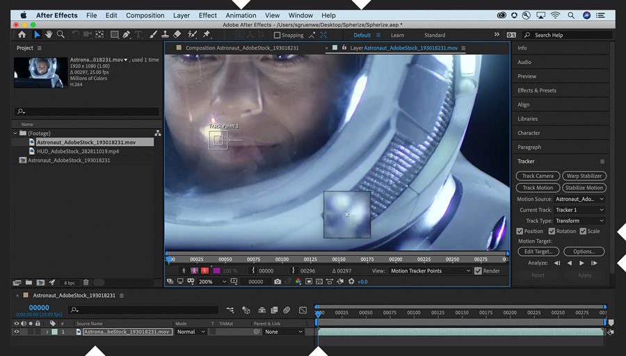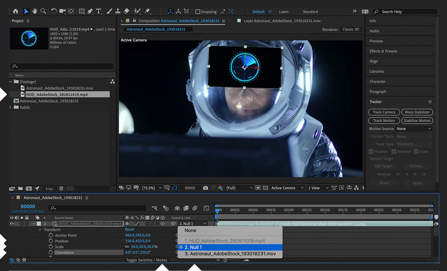 Move the playhead back to the beginning of the comp. Add your HUD footage above the null layer and toggle its 3D Layer setting on. (You may need to click Toggle Switches/Modes at the bottom of the Timeline panel to reveal this control.) Parent the HUD layer to the null object so it inherits the tracking data you just generated. Scale the layer and then position it (in all three dimensions) near the intended surface — in this case, the curved surface of the astronaut’s spacesuit helmet.