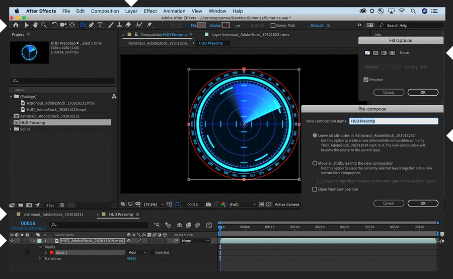 To mask only the HUD design, first select the HUD layer and choose Layer > Pre-compose, making sure Leave All Attributes is selected in the Pre-compose dialog box. Double-click the new precomp layer so it opens in a new Timeline panel tab. Press Q to activate the Shape tool and its properties in the toolbar. (Keep pressing Q to cycle through all the shapes until you find an appropriate one for your mask.) Click Fill in the toolbar and select None in the Fill Options dialog box. Do the same for Stroke. Keeping the HUD selected in the precomp, draw your mask. (Holding down Shift keeps the dimensions proportional. Pressing Command/Control+T displays a bounding box.)